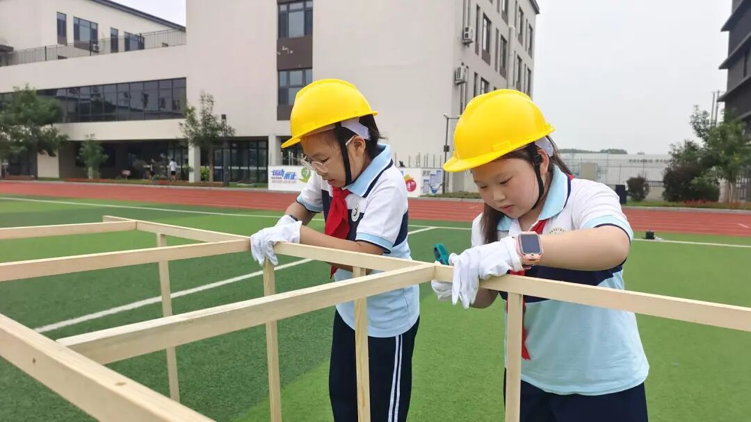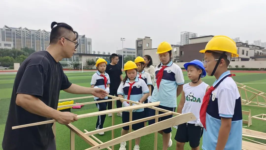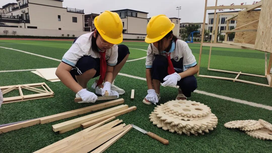负责社团课的张晓龙老师是位专业木工师傅。两年前,经营着工作室的他,被学校请来负责孩子们的木艺社团课。两年多来,他带着60多个孩子“玩转”木头:从认识不同木材、安全操作工具,到看懂图纸、精准切割组装,孩子们的作品越做越棒——帆船、投石机、跨海大桥、灌溉机,足足攒了上千件。