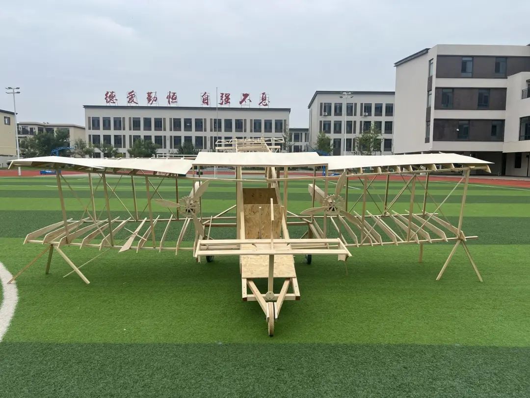 明媚的阳光下,这架1:1比例复刻的“飞行者一号”模型被小心翼翼地搬运至学校操场中央,当完成最后的一些零部件拼接后,由孩子们亲手打造的飞机模型瞬间成为全场瞩目的焦点。