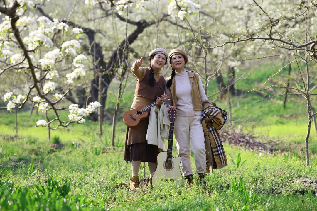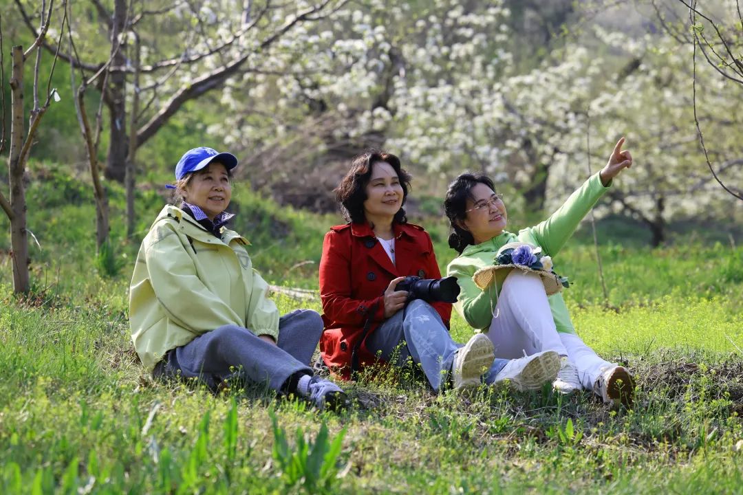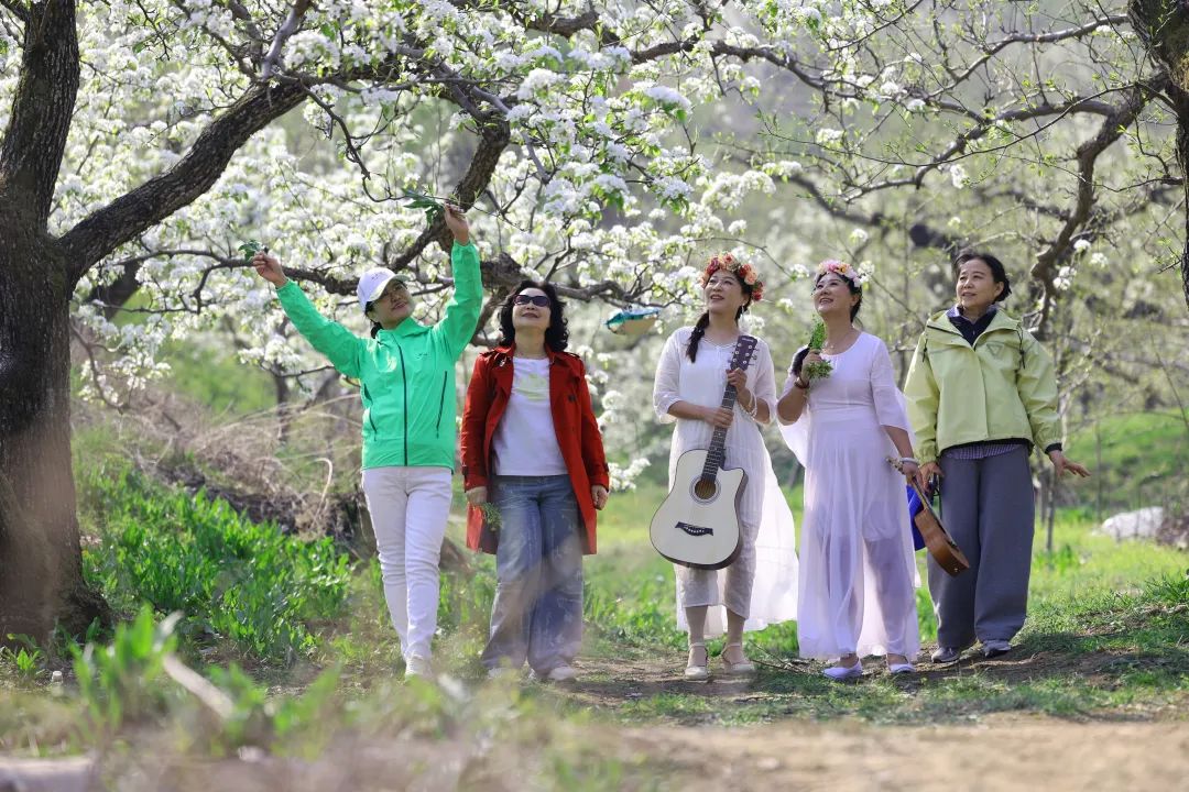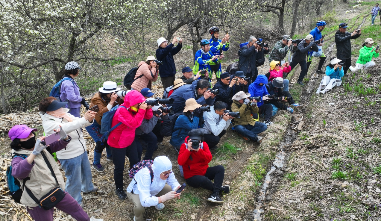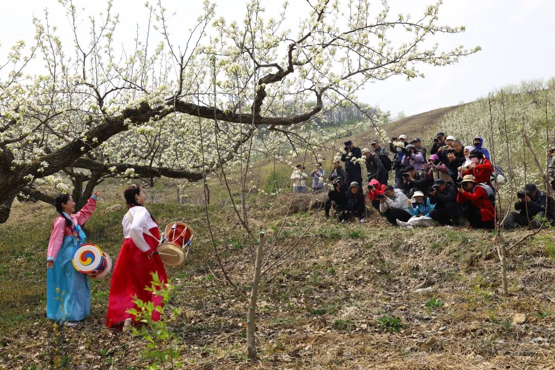 乘坐大巴车从沈阳专程赶来的50余位辽宁省老干部摄影协会摄影爱好者、游客,或漫步花海,或驻足拍照。大家在梨花树下拉起手风琴,跳起朝鲜族舞蹈,欢声笑语荡漾在山坳间。