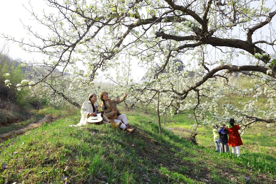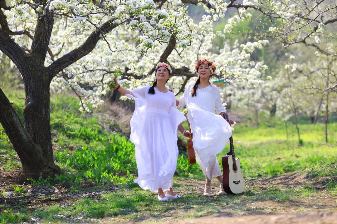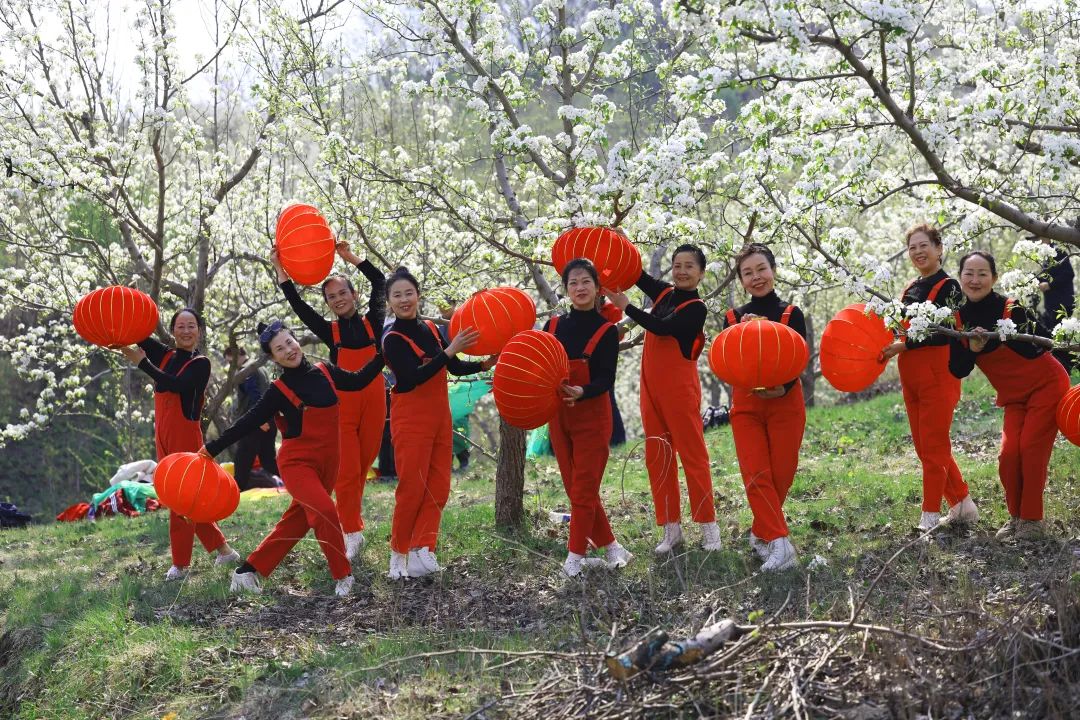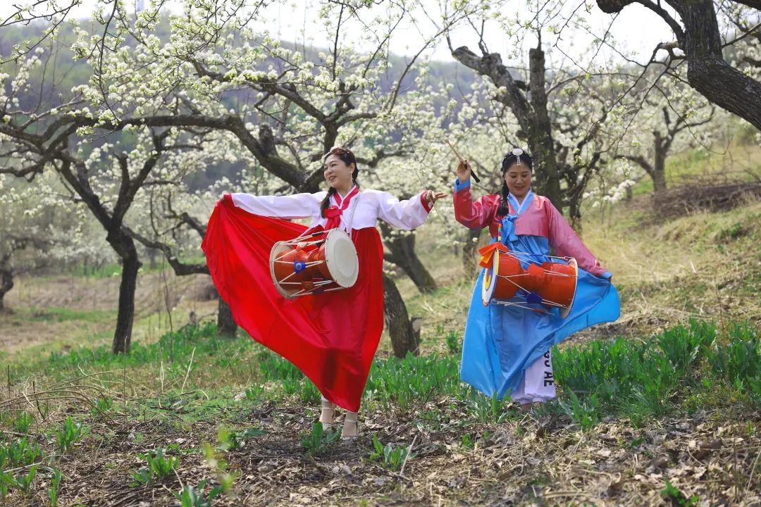 山的另一边,来自铁岭的舞蹈队,也身着民族服饰翩翩起舞,洁白如雪的梨花缀满枝头,微风拂过,惬意而浪漫,尽享“梨韵之美”。