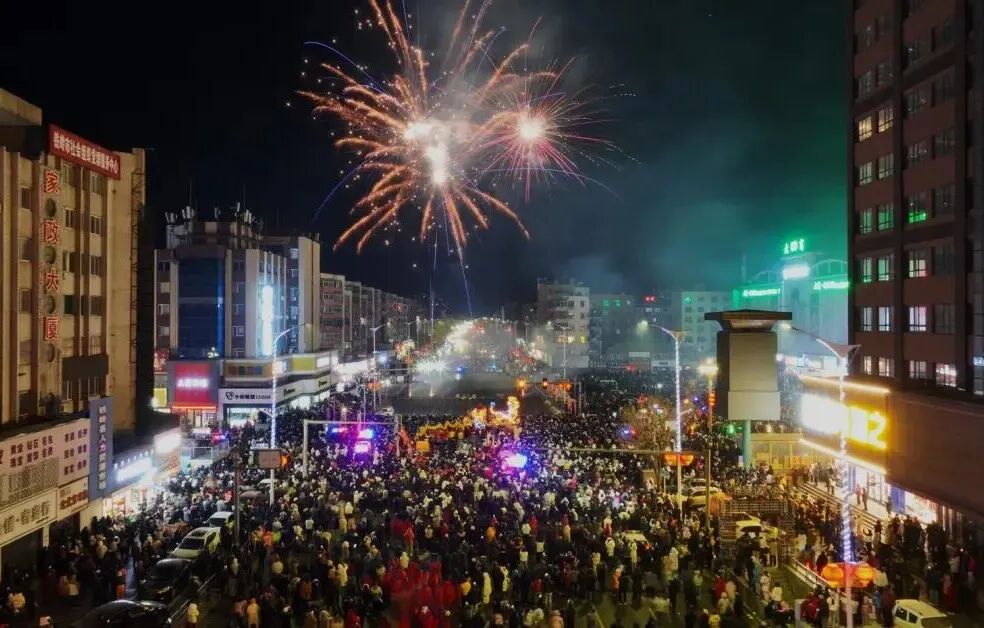 当巡游队伍抵达大商新玛特西侧停车场终点,璀璨烟花凌空绽放,五彩光影照亮夜空,将当晚的氛围推向最高潮。