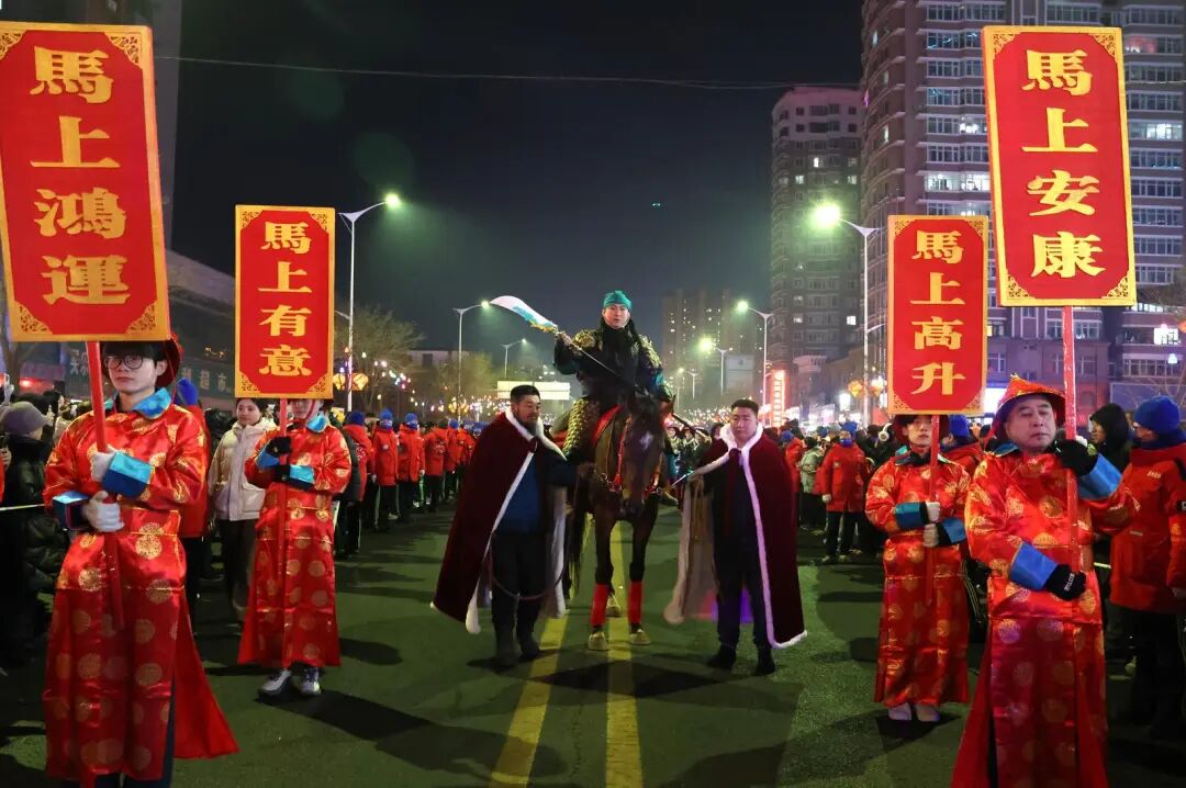紧随其后,舞龙舞狮翻腾跳跃、皇家仪仗庄重大气,关羽赤兔、铁岭卫队、龙腾华伞、仙女送福、财神赐福、“马到成功”NPC方阵依次亮相,一步一景、一眼一喜。