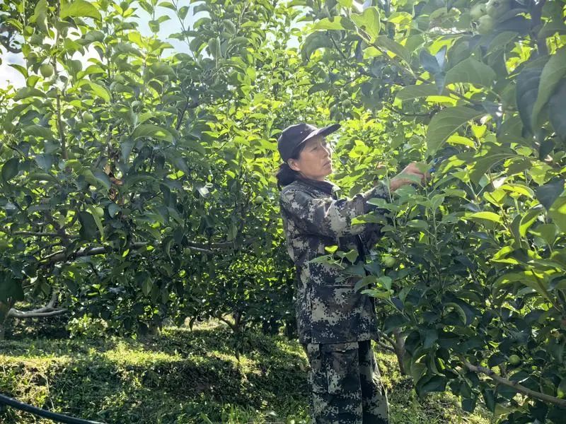 日头渐升,热浪烘着山峦。驱车沿山盘旋,层层叠叠的果树一直铺展到视野尽头,油亮的叶片在阳光下闪着绿金,可爱的果子就藏在绿叶间,这里是西丰县天德镇天来村。果农李雪峰手持修枝剪,在林间穿行,光影斑驳,筛过他黝黑的面庞和粗粝的大手。“咔嚓”一声轻响,一根多余的枝条应声而落。“20年前,”他粗糙的手指摩挲着同样粗糙的树干,像在翻阅一本写满艰难的书,“草都稀稀拉拉,石头缝里抠食,难着呢。”