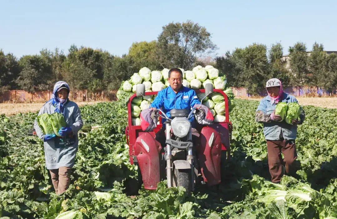记者留意到,田里的白菜棵棵紧实饱满,叶片包裹得严严实实。肖长录随手捧起一棵,自豪地介绍:“这用的都是‘水师营’种子,最大的特点就是耐储存,口感好,特别适合积酸菜,在市场上非常受欢迎。”正说着,一辆满载白菜的农用车发动起来,准备出发。他笑着补充:“这些菜都是直接运往银州区的批发市场,现在地头价能卖到五毛钱一斤,价格和去年差不多,比较稳定。照这个势头,今年肯定能有个满意的收成!”