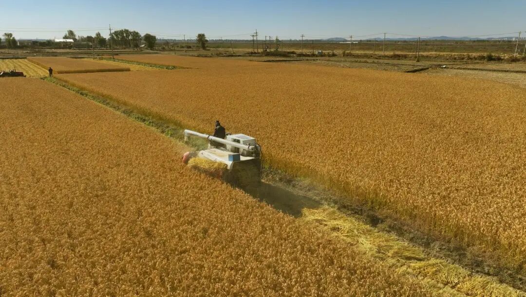 金秋十月,铁岭县双井子镇永收村的金利家庭农场里,一片繁忙的丰收景象。一望无际的稻田泛着金黄,5台大型收割机正开足马力,在田间轰鸣作响。