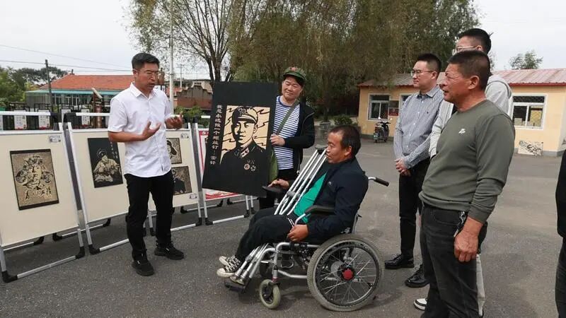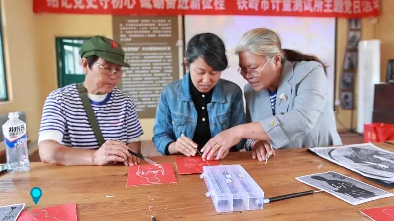工作室负责人王凤介绍,汤牛堡子村出木匠,村里有雕花刻字的传统。2024年9月,得知市委组织部发起的“非遗夜校”活动中有版画课程,曾在村里担任第一书记的市委党史研究室主任关利群就主动联络,把授课老师请到村里,手把手给村民“传经”。“开始的时候,老师说的木刻术语我们听不懂,关主任就用铲地、犁地等大家伙儿熟悉的场景帮着‘翻译’。”