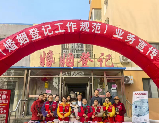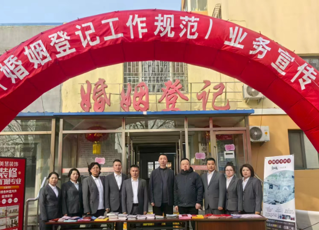 2月14日,许多新人选择在这天携手步入婚姻殿堂。为确保《婚姻登记工作规范》有序、高效开展,保障新人合法权益,由市民政局局长宋涛、副局长许铭峰带领婚姻登记处全体工作人员特就《婚姻登记工作规范》业务及服务事项开展普法业务宣传活动。