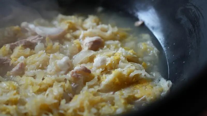 而酸菜的制作同样讲究时令与古法,必须选用霜降后收割的青帮白菜。此时的白菜糖分足、纤维嫩,经过井水浸泡、加盐揉搓后,码进陶缸里密封发酵45天以上,直到酸菜呈现出透亮的淡黄色,酸香中带着清甜,才能与黑猪肉“相配”。
