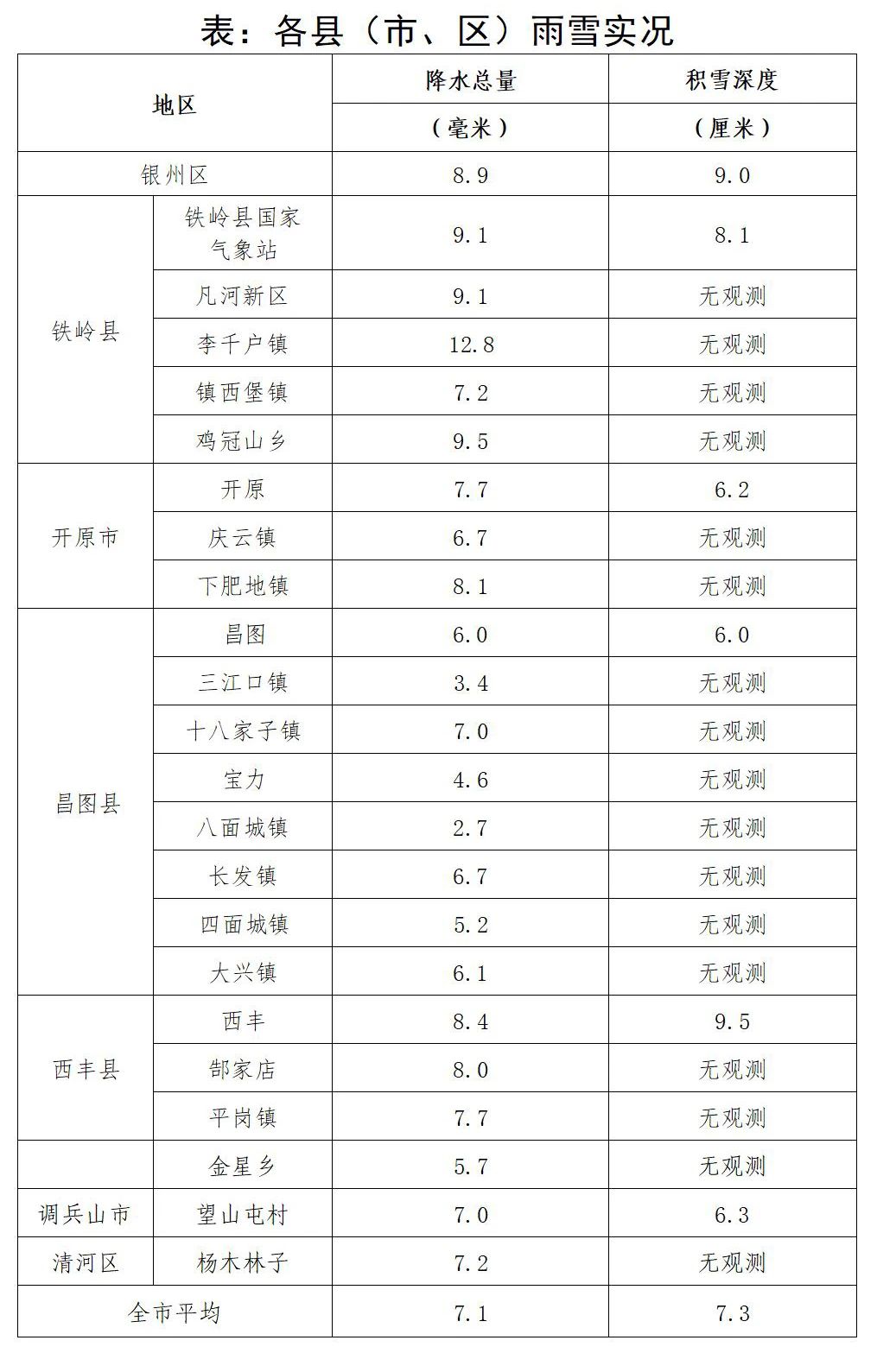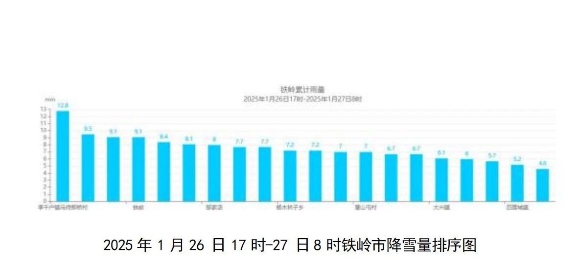 2025年1月26日17时至27日8时,各县(市、区)平均降雪量(单位:毫米)为:银州区8.9,清河区7.2,调兵山市7.0,开原市7.5,铁岭县9.7,昌图县5.2,西丰县7.5,经开区8.9。累计降雪量位列前三的是:铁岭县李千户12.8毫米、铁岭县鸡冠山9.5毫米、铁岭县国家气象站9.1毫米。