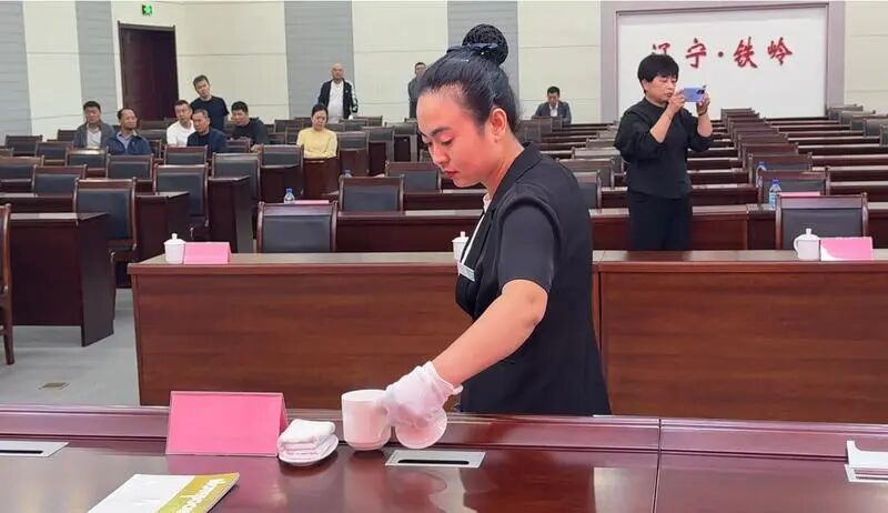 •会展中心二楼一会议室内,3名服务人员协作搭建会场,桌椅间距按标准精准排列,桌签朝向毫厘不差,茶杯与文件摆放成一条直线;