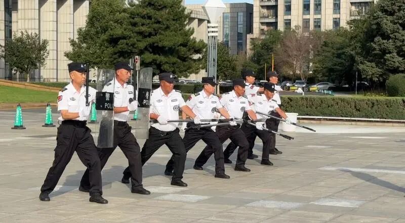 •主楼前广场上,灭火演示中干粉灭火器对准火源根部扫射,火焰瞬间熄灭,防暴棍、抓捕器等器具展示则尽显专业底气。