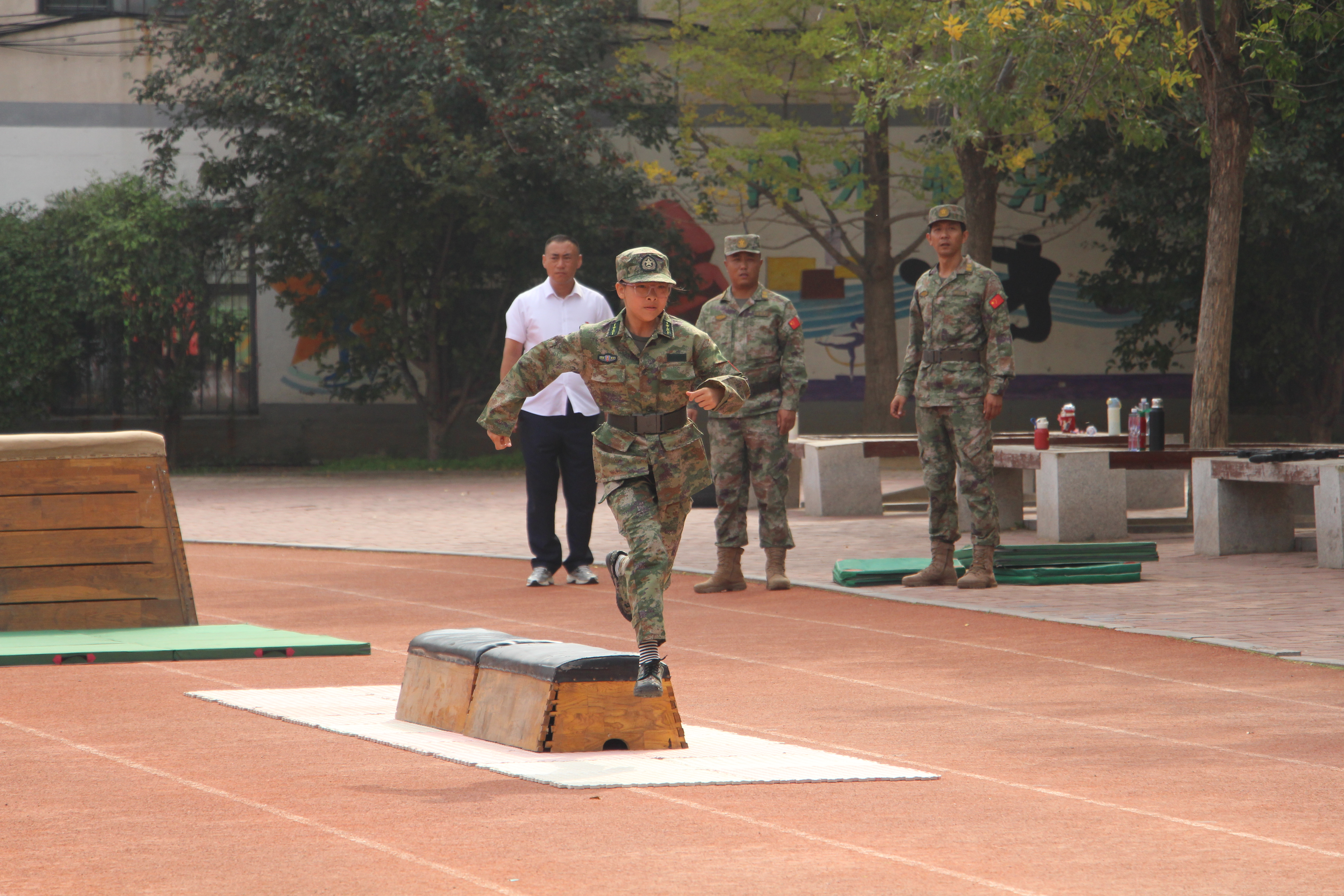 少年军校队列展示队伍迈着铿锵有力的步伐登场。整齐的方阵、挺拔的身姿、饱满的精神,每一个动作都凝聚着汗水与坚持,赢得了师生们的阵阵掌声。操场上,“少年军校”队员们将战术基础动作、障碍射击、实战冲锋等个人参赛项目逐一展示,队员们匍匐前进时动作敏捷,跨越障碍时果断利落,模拟射击时眼神坚定,将少年军校的风采展现得淋漓尽致,也让在场师生深刻感受到“少年强则国强”的蓬勃力量。