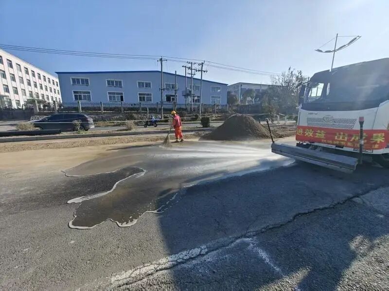 施工人员边降尘边清扫开抚街。