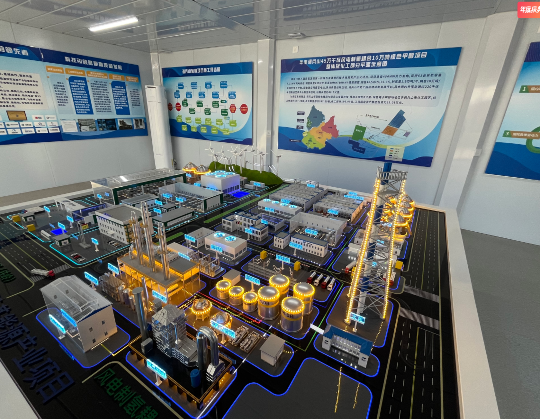 在辽宁华电调兵山45万千瓦风电制氢耦合绿色甲醇一体化示范项目的展厅里,项目还仅仅是沙盘和平面图,但其战略支点作用却在细节上展露无遗。